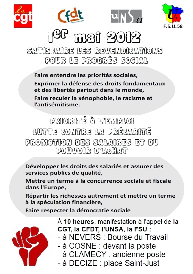 Vous êtes ici : Accueil Départements Nièvre Actualités 1er mai 2012 : les salariés s’expriment !! 23 avril 2012 Départements 1er mai 2012 : les salariés s’expriment !! Partager cet article :