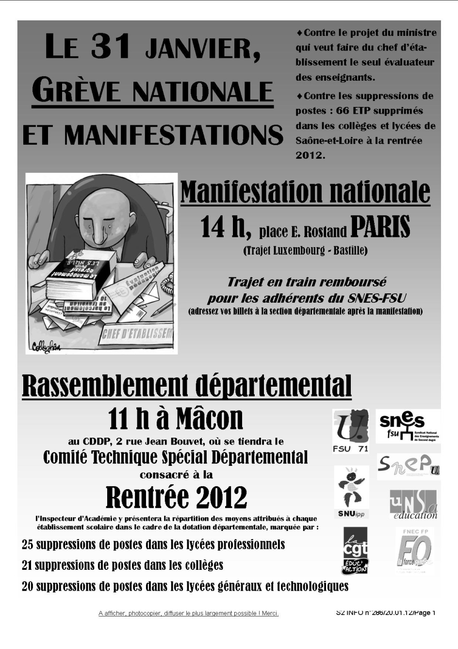 De plus en Saône-et-Loire, l’intersyndicale éducation (UNSA, FO, CGT, FSU) a décidé d’appeler les personnels du Primaire et du Secondaire à la grève et à un rassemblement à Mâcon devant le Comité Technique Départemental : celui-ci est convoqué pour examiner les mesures proposées pour chaque établissement par l’Inspecteur d’Académie dans le cadre de la préparation de la rentrée 2012. La section départementale devrait disposer des documents de travail de ce CTSD dès le 23 janvier. N’hésitez pas à la contacter et à participer au Conseil Départemental du SNES du 26 janvier consacré, entre autres, aux conditions de la rentrée 2012 dans les collèges et les lycées de notre département.