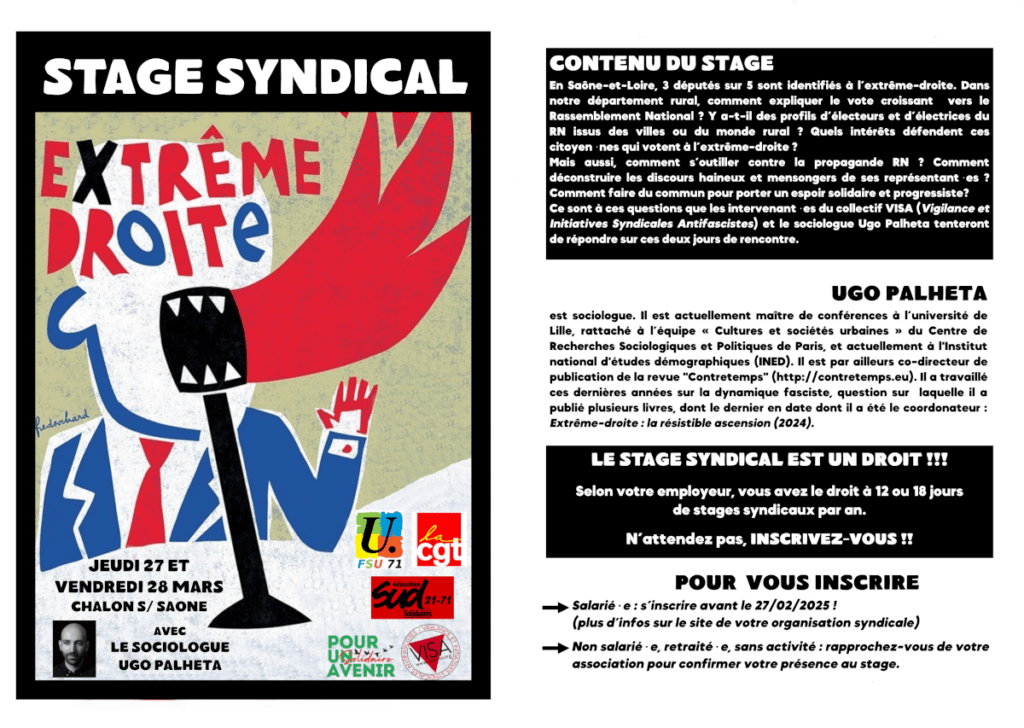 Aussi, à l’initiative de la FSU 71, en collaboration avec la CGT 71 et Sud’Educ 21-71, un stage est organisé en partenariat avec le collectif Vigilance et Initiatives Syndicales Antifascistes (VISA).