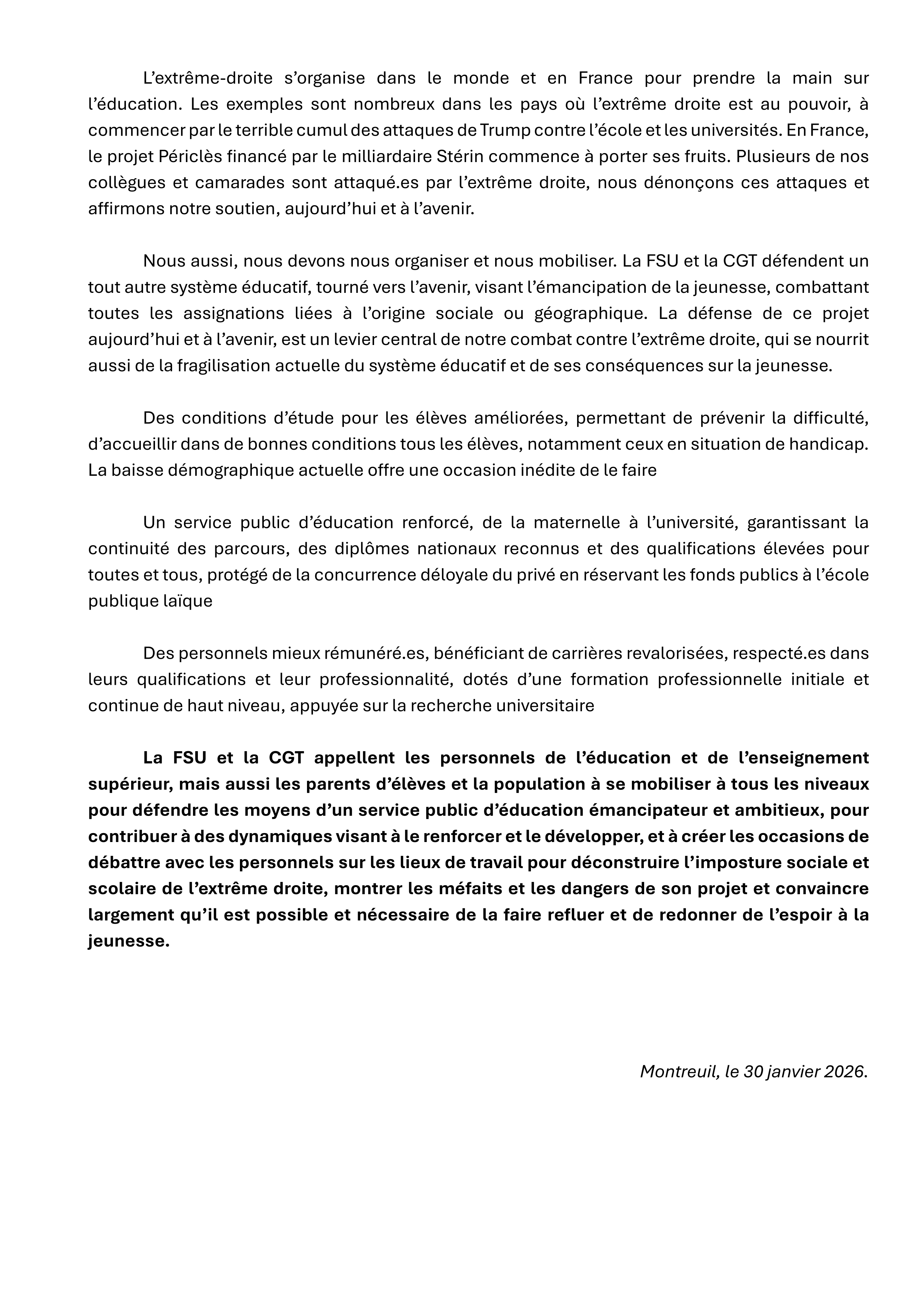 Suite à la tenue du colloque « L’extrême droite et l’école » organisé conjointement par la FERC-CGT et la FSU, vous trouverez ci-dessous l’appel à mobilisation commune des acteur.trices de l’éducation pour renforcer l’école publique face aux attaques du plus en plus marquées de l’extrême droite.