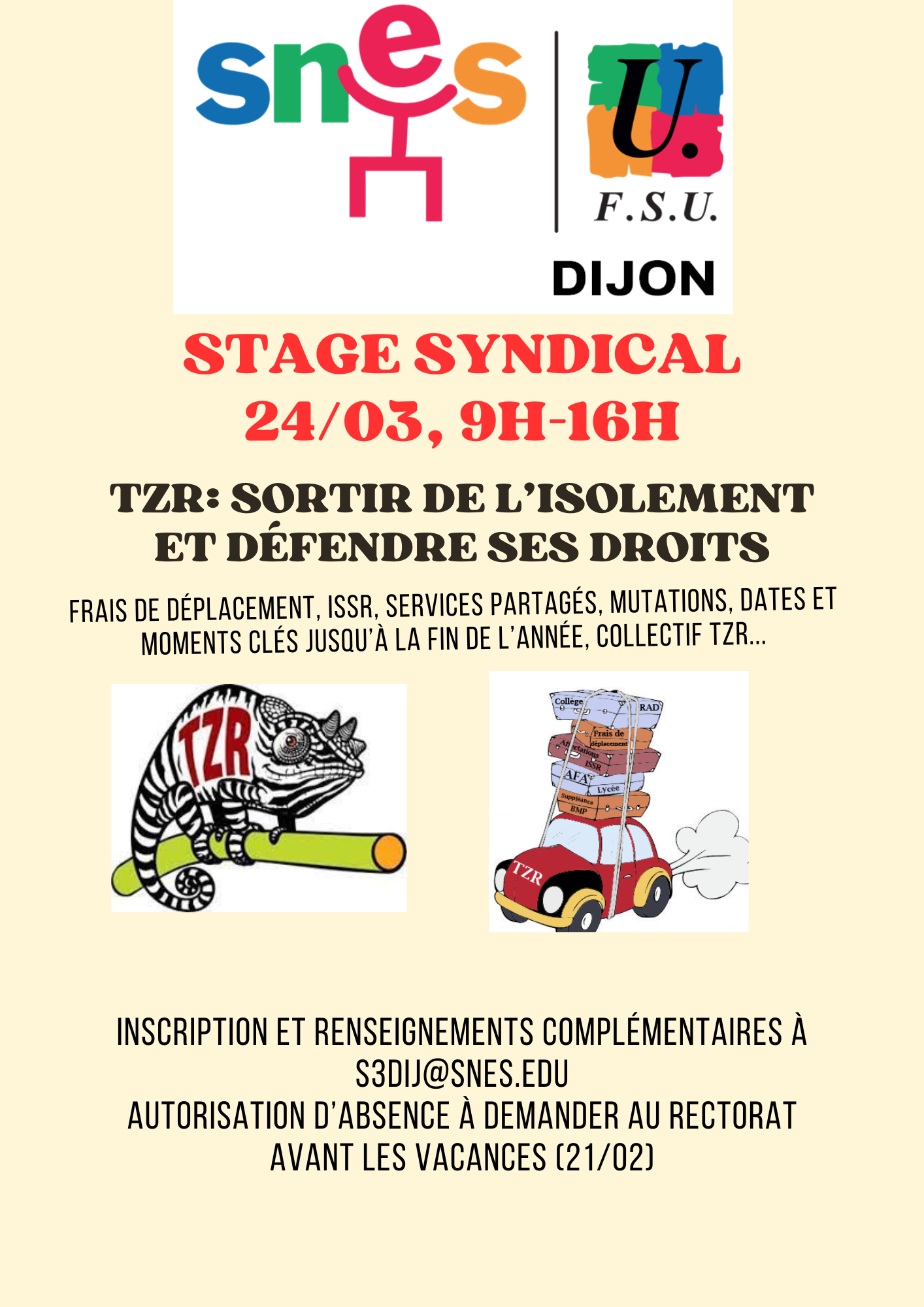 syndiquées étant prioritaires, c’est bien normal). - Un stage spécial TZR est organisé le lundi 24 mars 2025 de 9h30 à 16h, (accessible à tous et