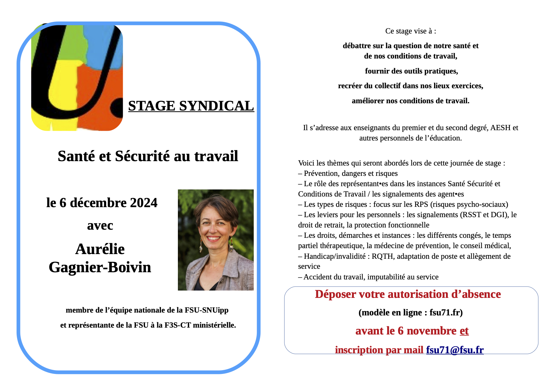 Se stage se déroulera en présence d’Aurélie Gagnier-Boivin, membre de l’équipe nationale de la FSU-SNUipp au secteur Revendicatif et représentante de la FSU à la F3S-CT ministérielle.