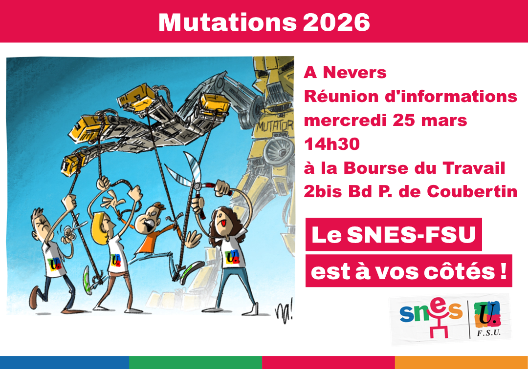 Selon les informations disponible sur SIAM, la saisie des vœux pour les mutations intra aurait lieu du 26 mars 2026 à 12h00 au 8 avril 2026 à 23h59. Le SNES-FSU 58 propose donc une réunion d’informations à destination de tous les enseignants du second degré, le 25 mars à 14h30 dans ses locaux au premier étage de la Bourse du Travail de Nevers (Bd Pierre de Coubertin).