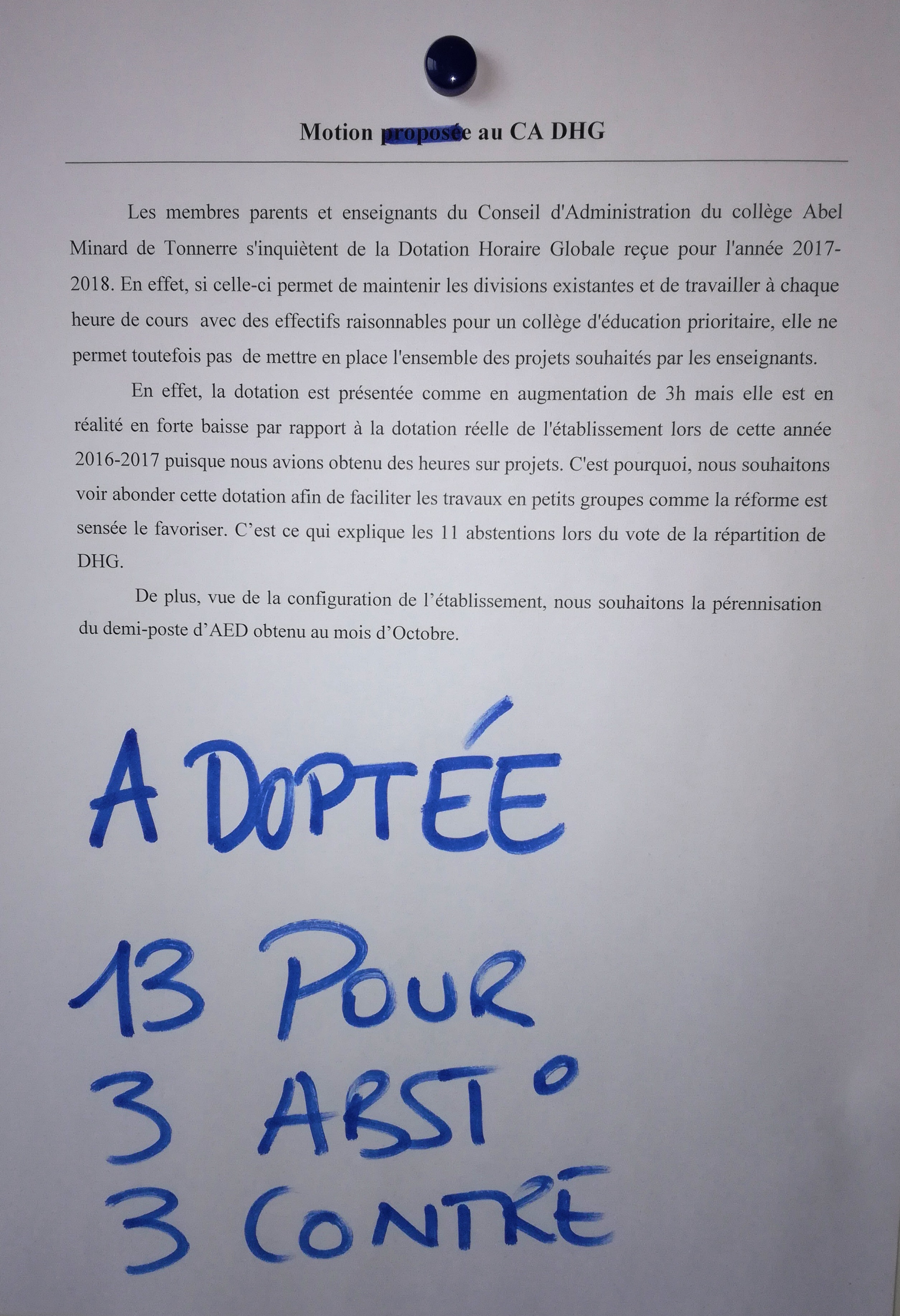 – le collège de Tonnerre qui demande une dotation supplémentaire et le maintien de tous les postes d’AED.