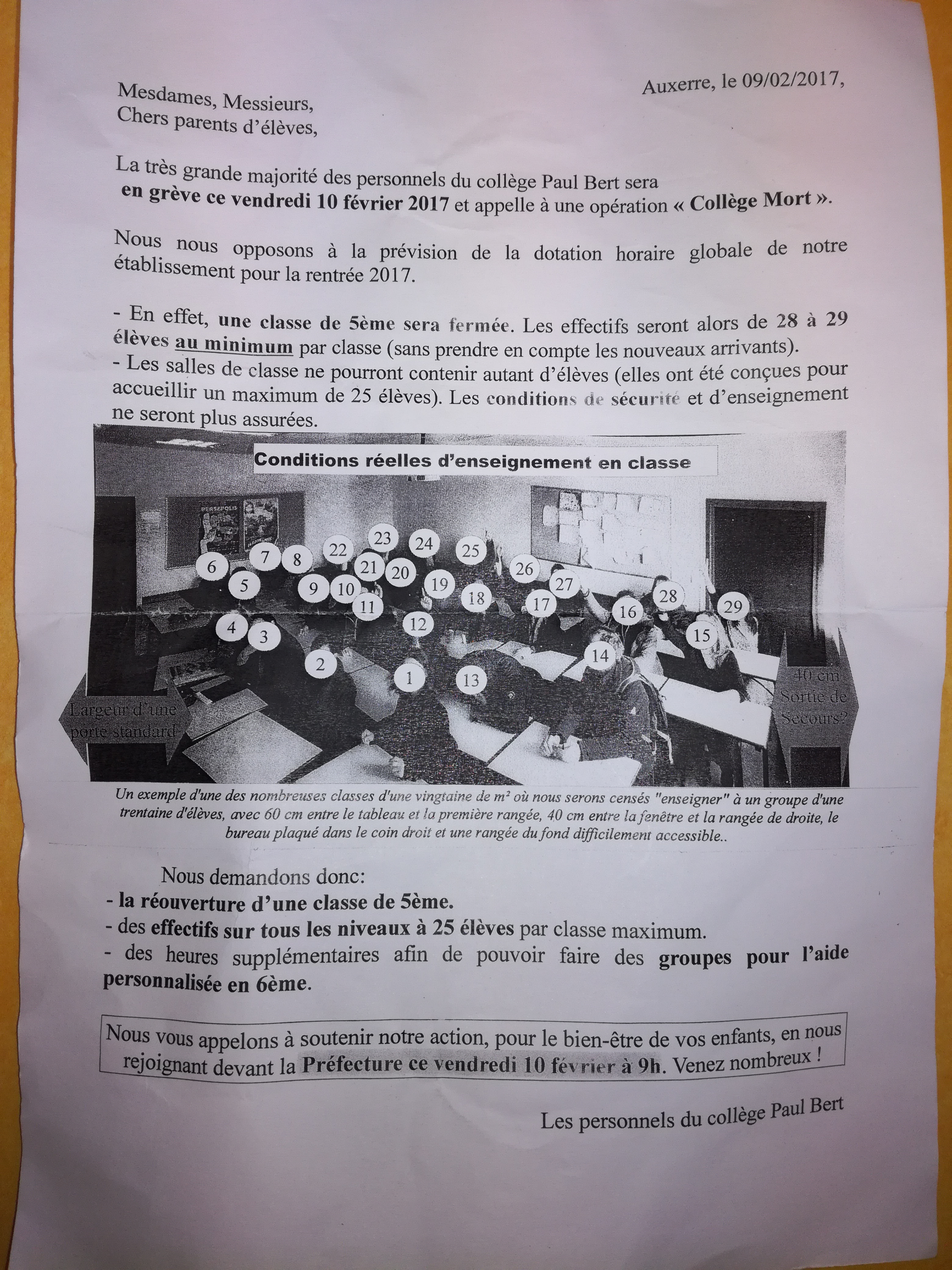 – le collège P. Bert qui avec des effectifs stables perd 23 heures dans sa DHG : ils étaient en grève à 80 % le 10 février lors du CDEN soutenus par les parents d’élèves (tract en PJ).